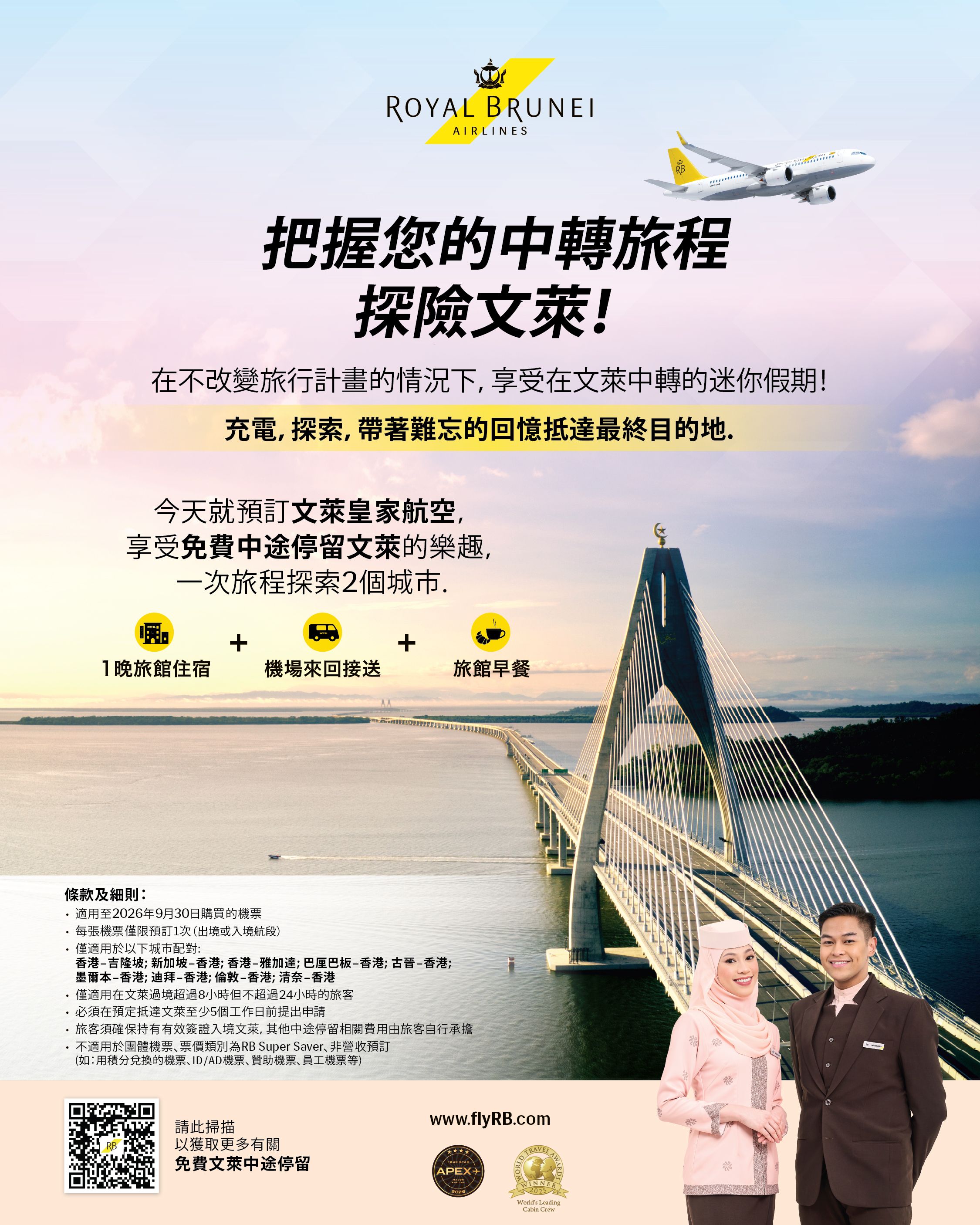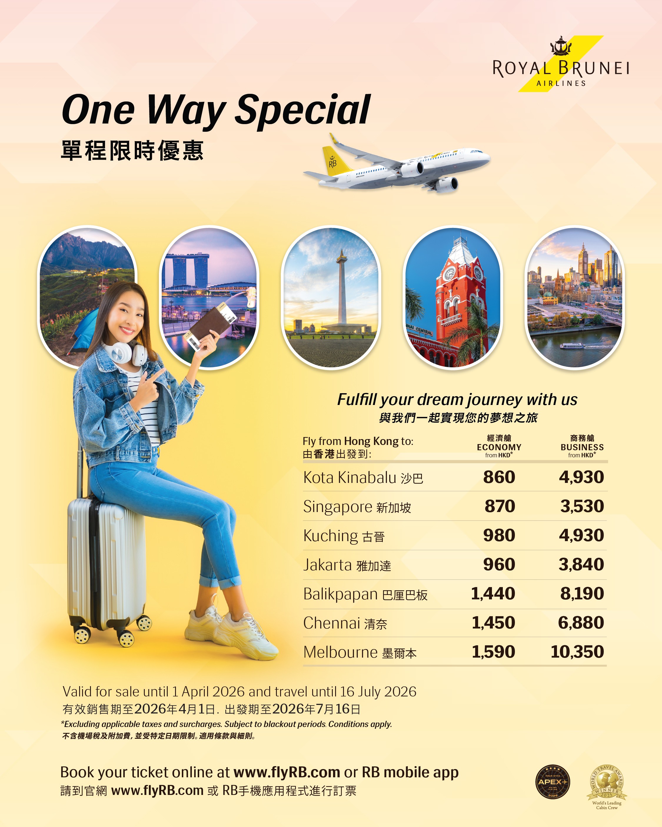 One‑way fares from Hong Kong start at just HKD 870 for Economy and HKD 3,530 for Business. Enjoy a complimentary Brunei stopover including hotel stay and transfers — an effortless way to elevate your journey.