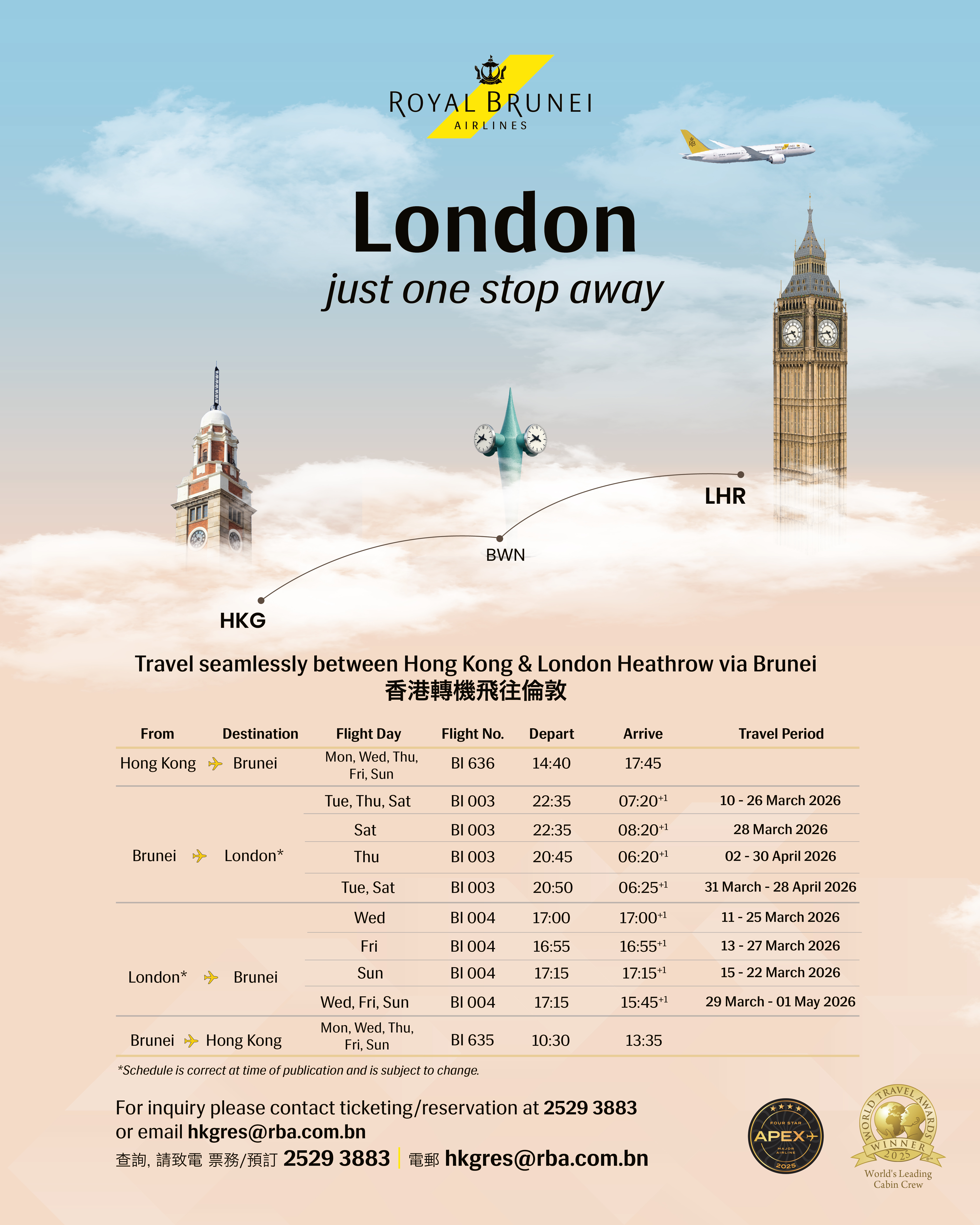 Fly from Hong Kong to London Heathrow with Royal Brunei Airlines and enjoy smooth connections, comfortable cabins, and award‑winning service throughout your journey.
