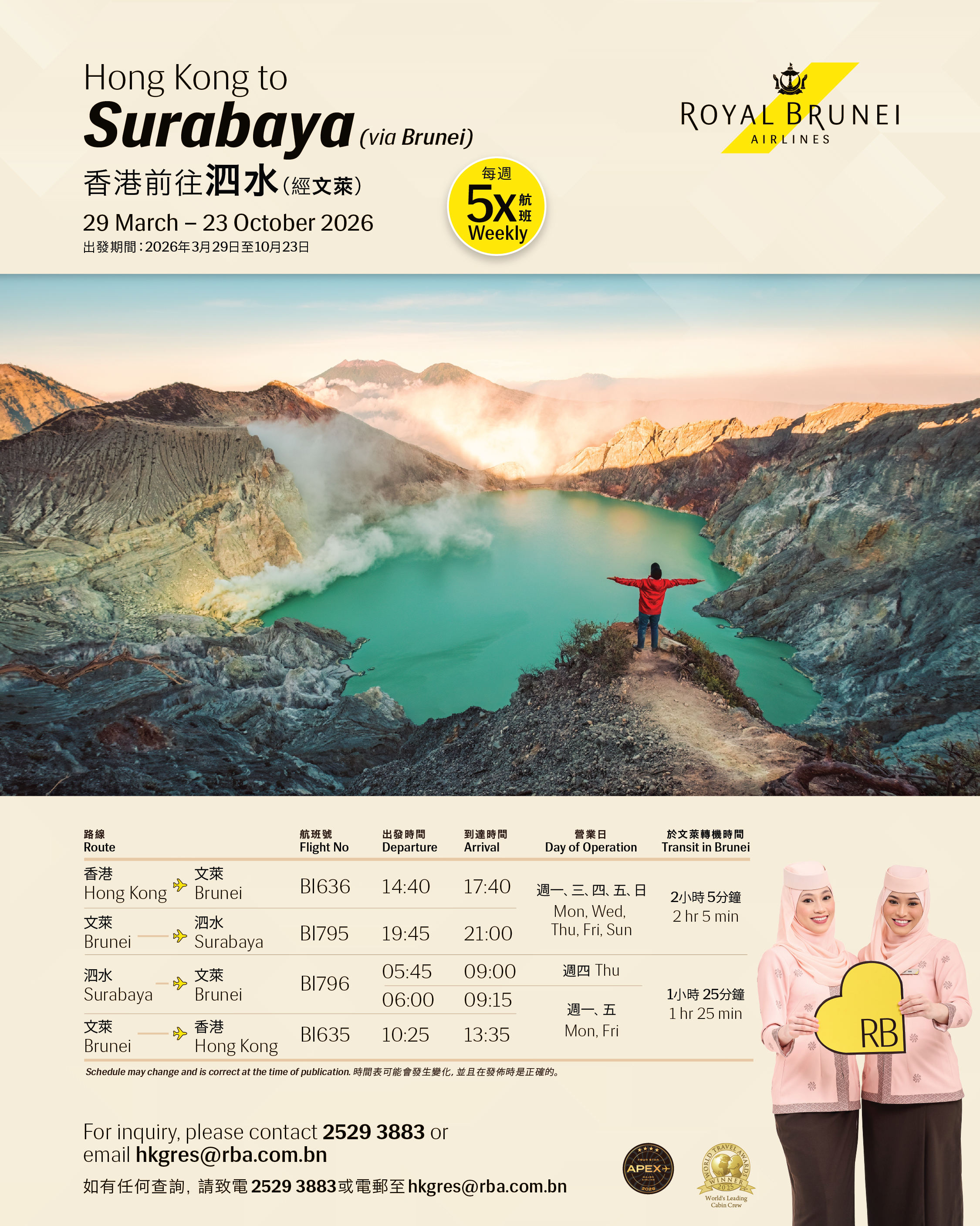 Discover the beauty of Surabaya and the iconic Ijen Crater with Royal Brunei Airlines. Enjoy seamless connections, comfortable flights, and warm Bruneian hospitality from 29 March to 23 October 2026. 📅 5 flights weekly 🛫 Convenient transit through Brunei 🌋 Perfect getaway for nature lovers and adventure seekers