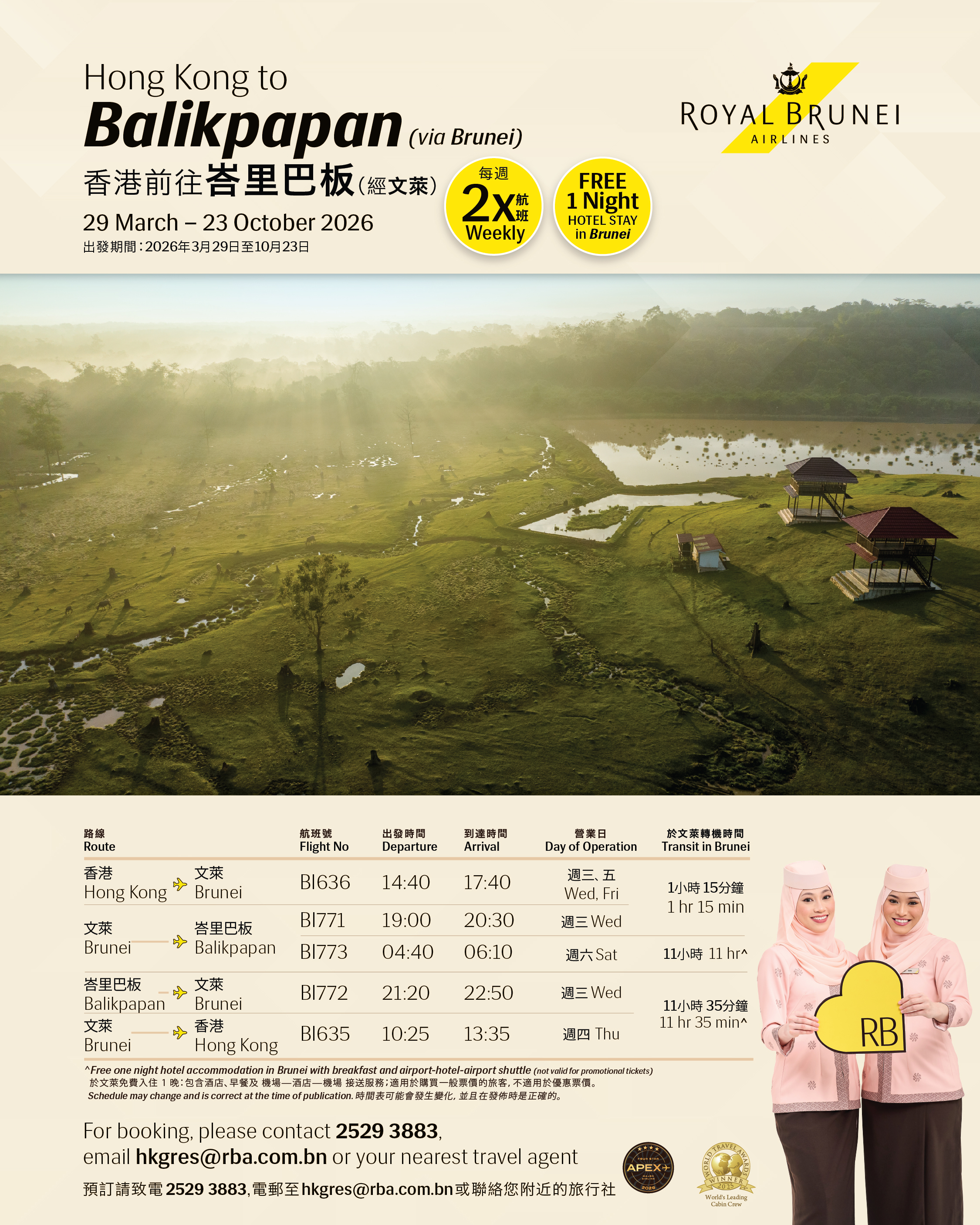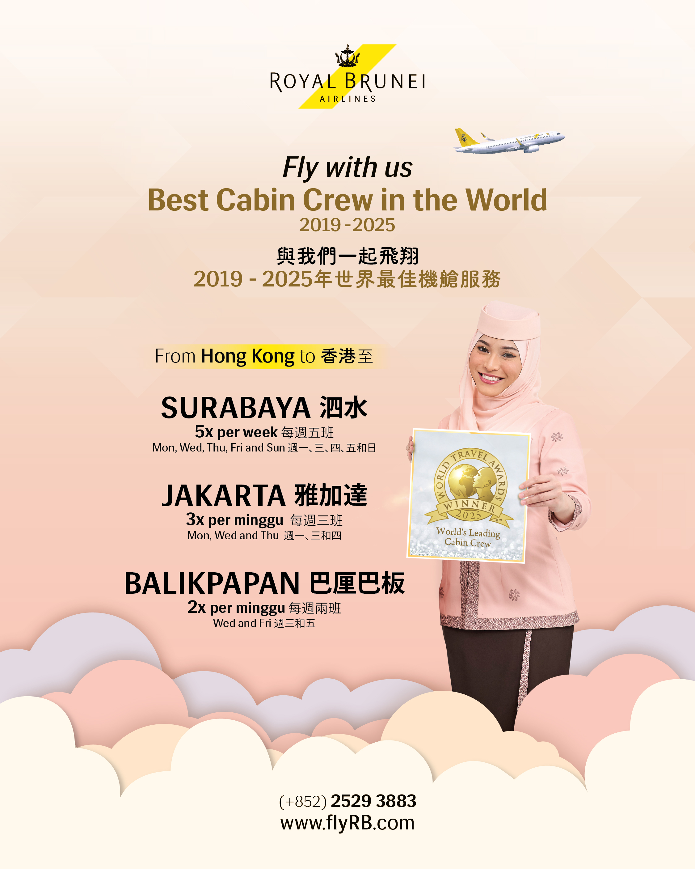 From Hong Kong, fly conveniently to: ✨ Surabaya — 5x weekly ✨ Jakarta — 3x weekly ✨ Balikpapan — 2x weekly Whether you’re traveling for business or leisure, enjoy a smooth and comfortable flight experience with Royal Brunei Airlines. Start your journey with award‑winning service today!
