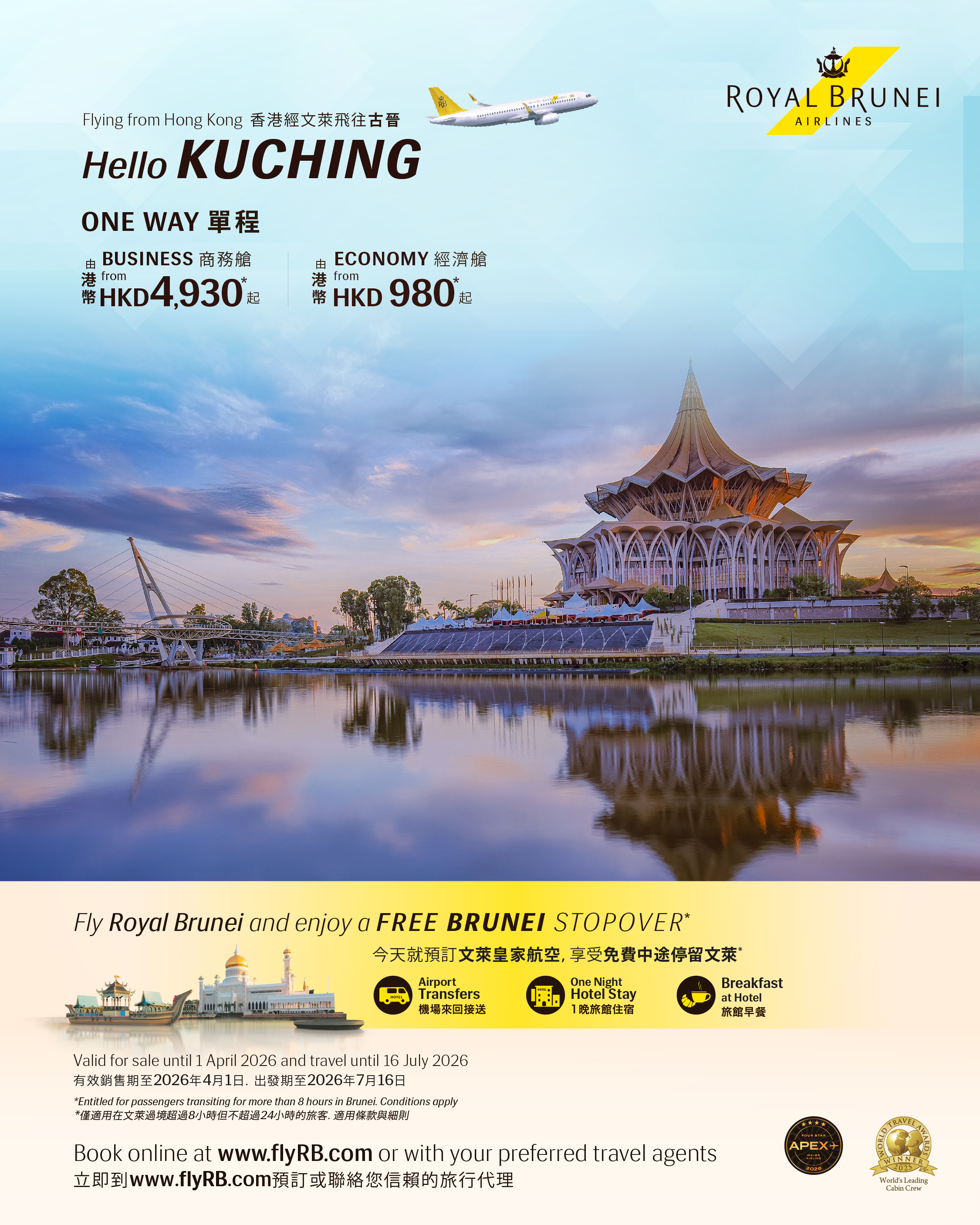 Fly from Hong Kong with Royal Brunei Airlines: ✅ Business Class from HKD 8,630 one-way ✅ Economy Class from HKD 1,680 one-way Plus, enjoy a FREE Brunei Stopover with: ✔ Airport Transfers ✔ One Night Hotel Stay ✔ Breakfast at Hotel 📅 Last Call! Book by 20 January 2026 | Travel 1–31 March 2026 🌐 Book now at [www.flyRB.com](http://www.flyrb.com/) or through your preferred travel agent.